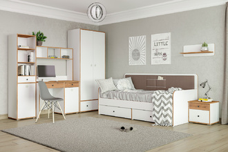Кровать детская Вуди 11.02 белый премиум, дуб золотой CRAFT, саванна латте, эко 100 кожзам гранд белый