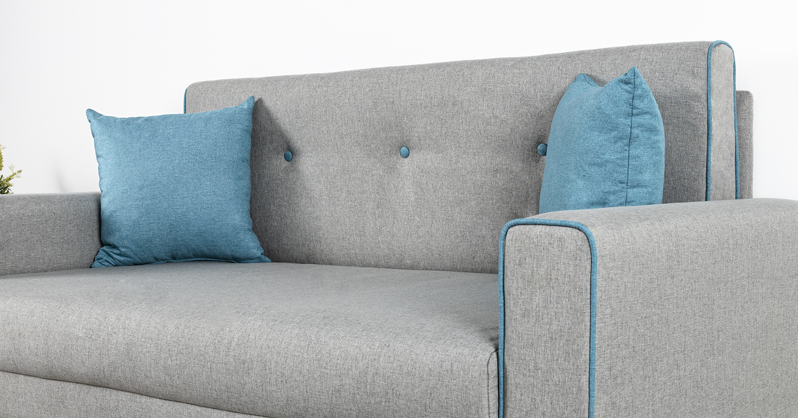 Декоративный контрастный кант по торцу спинки, торцу подлокотника, по верхнему срезу царги. Утяжки с пуговицами на спинке дивана. Две декоративные подушки в контрастной ткани.