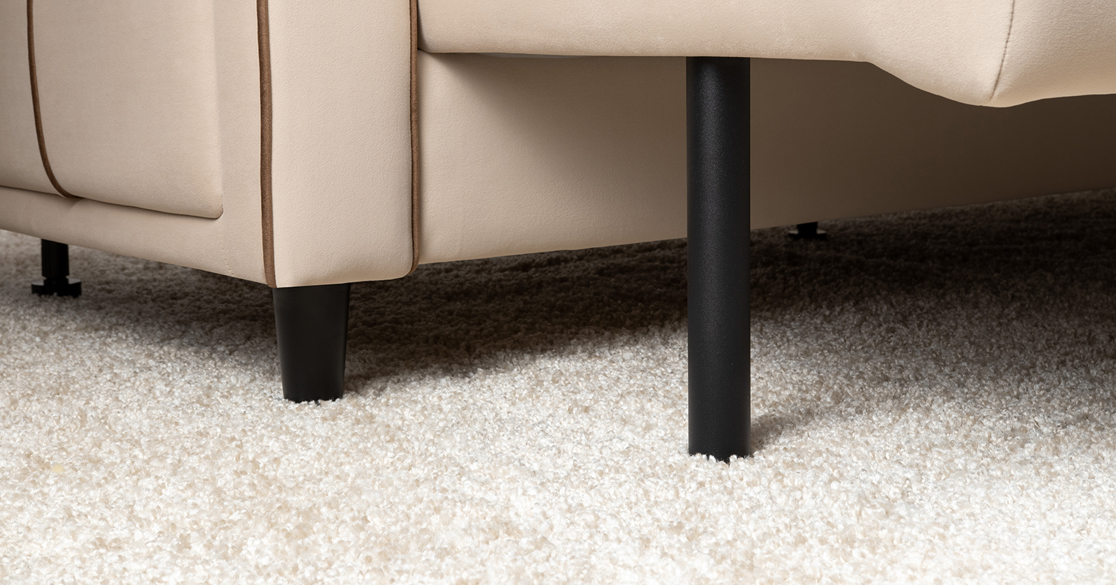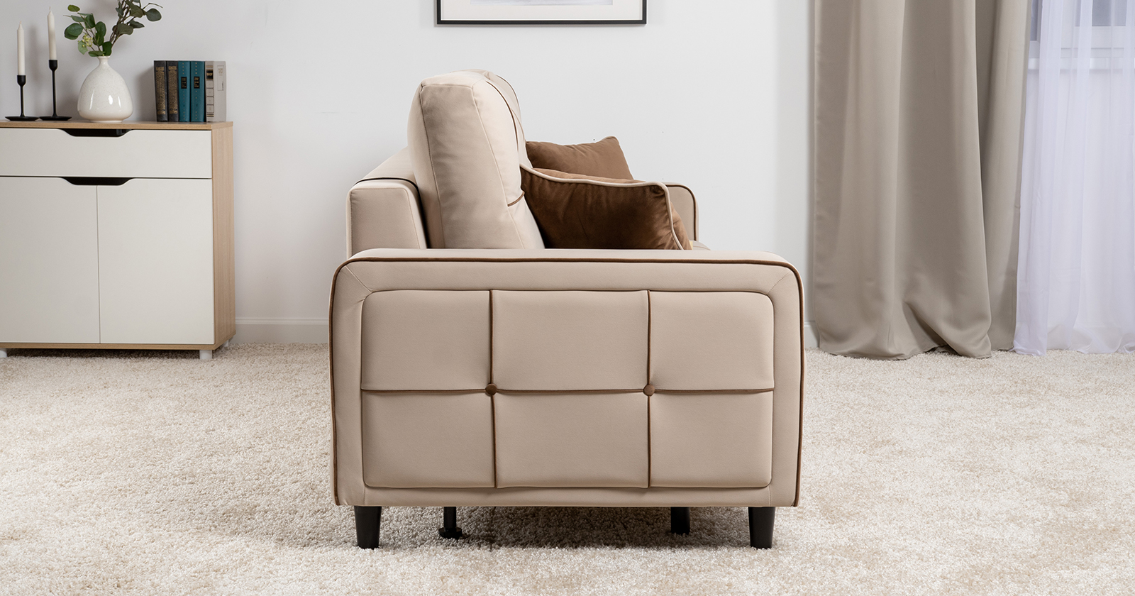 Декоративные канты на подушках и вставке подлокотников. Пуговицы в местах пересечения кантов на подушке и вставке подлокотников. По торцам подлокотников и думках контрастный декоративный кант. Защипы на сиденье и средней большой подушке.