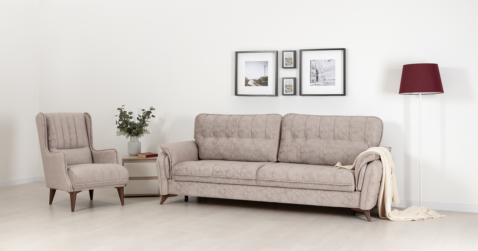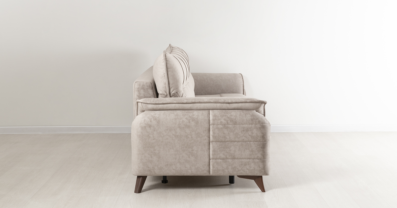 Декоративные канты на подушках дивана, подлокотниках и сиденье. Стежка на передней части сиденья и внешней части подлокотника. Защипы на верхней части подушки. Втяжки с пуговицами на приспинных подушках.
