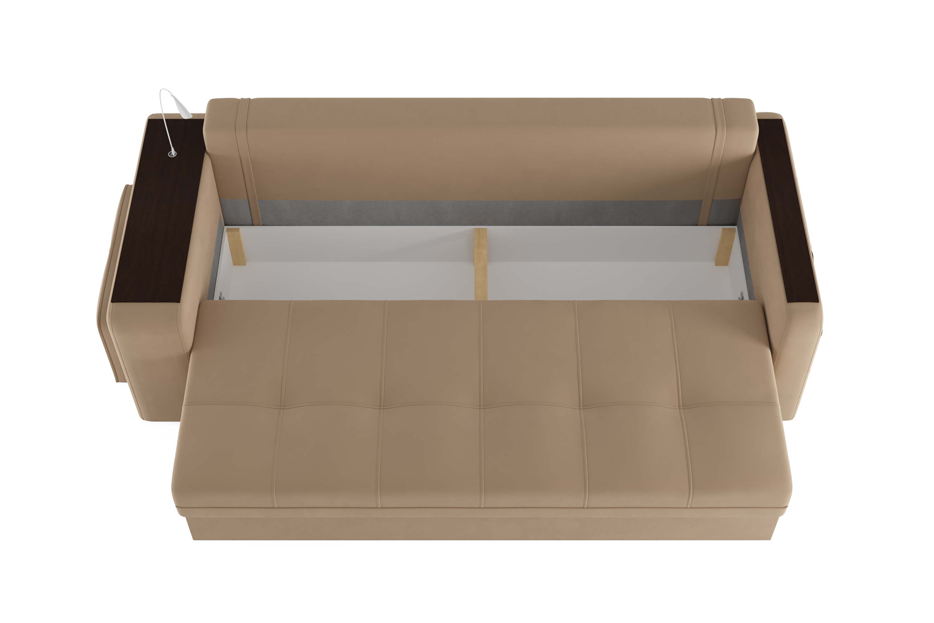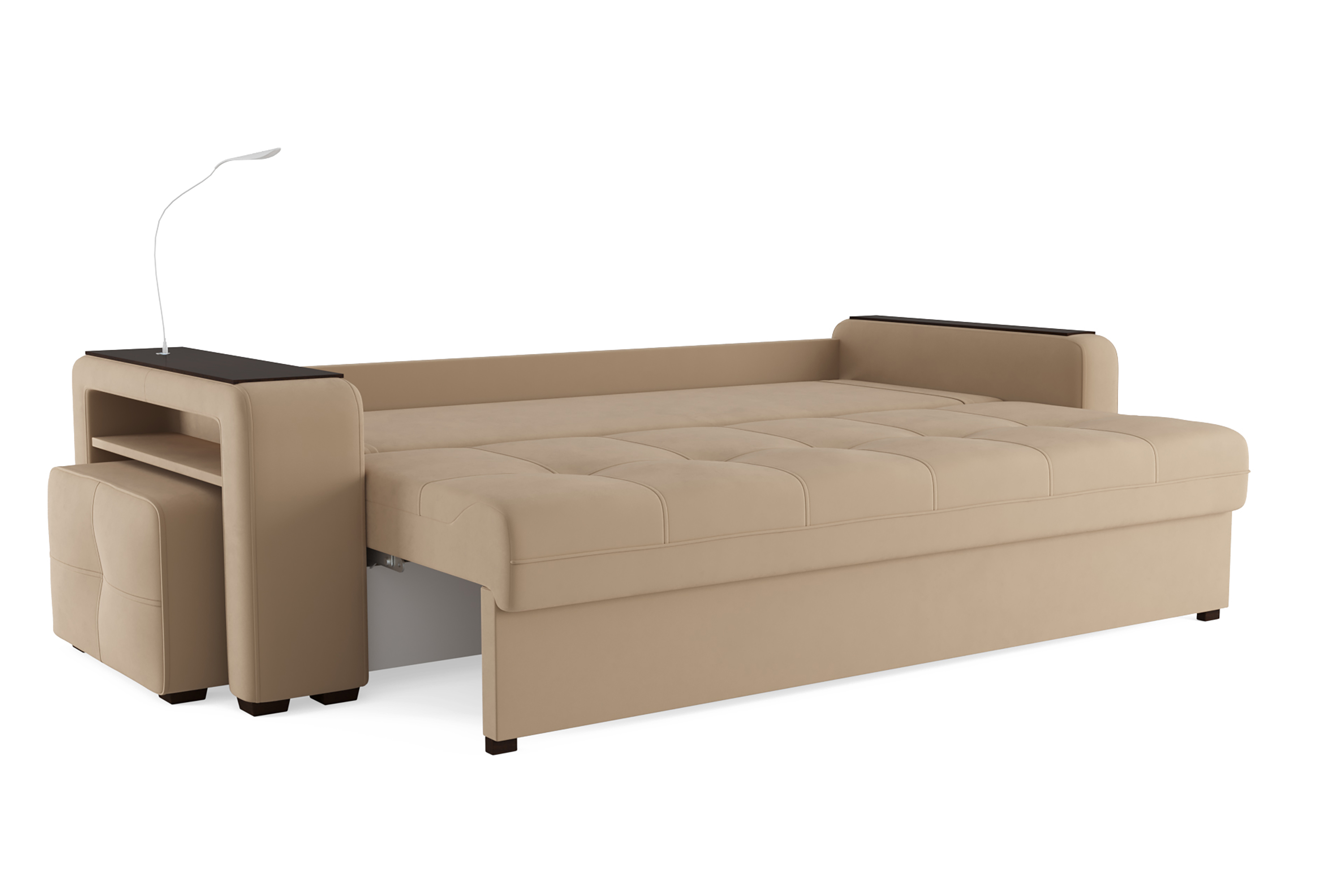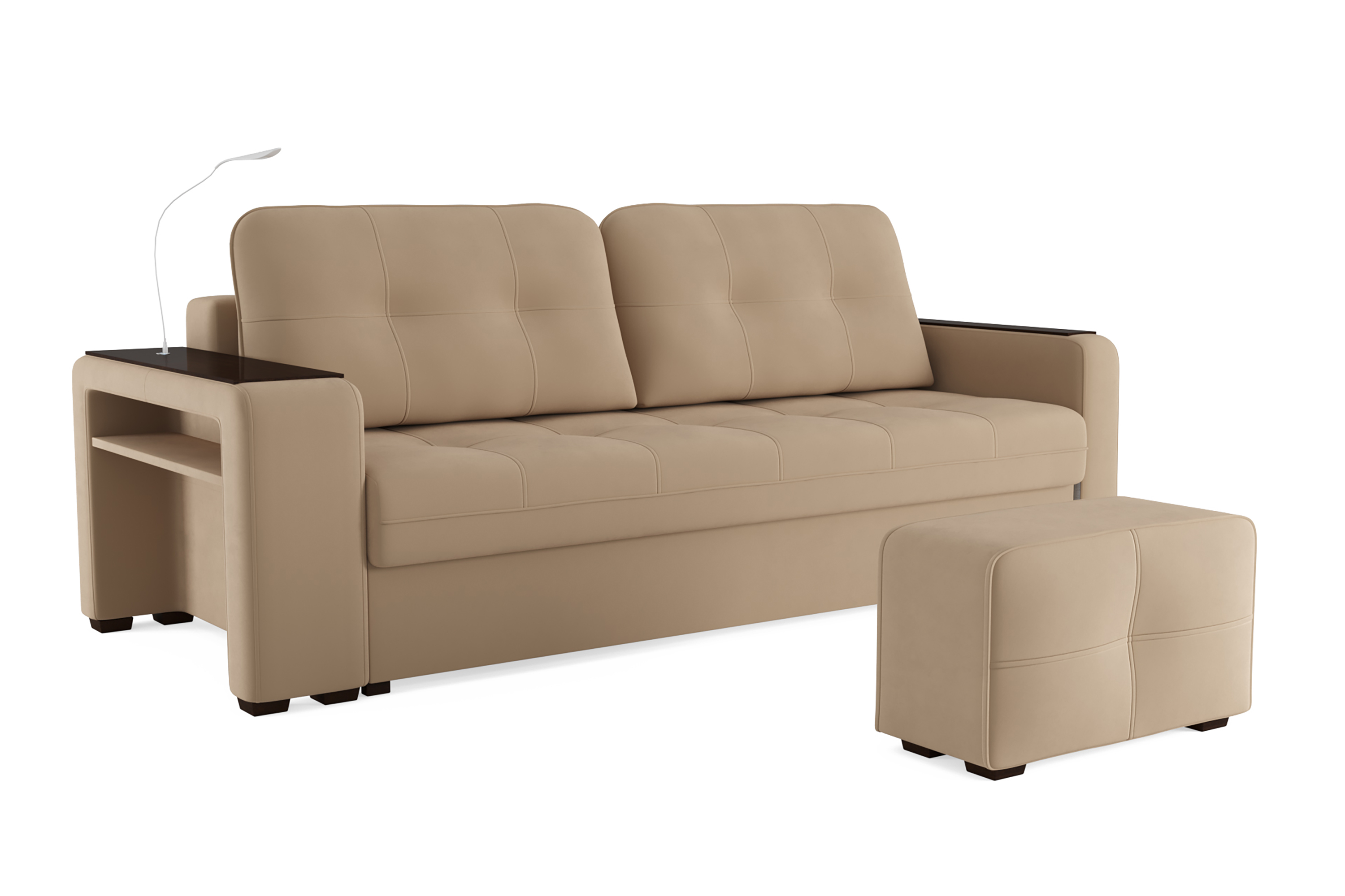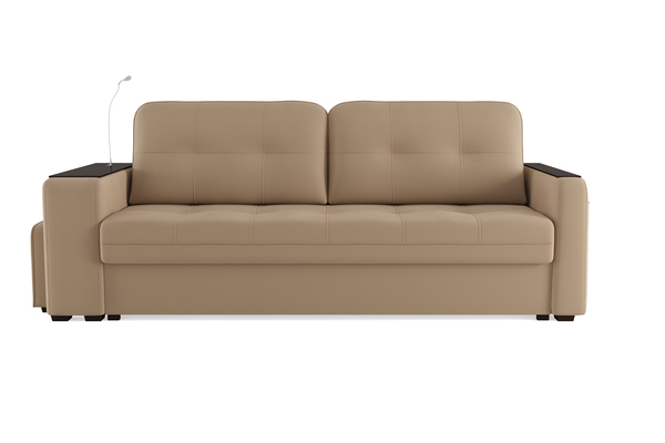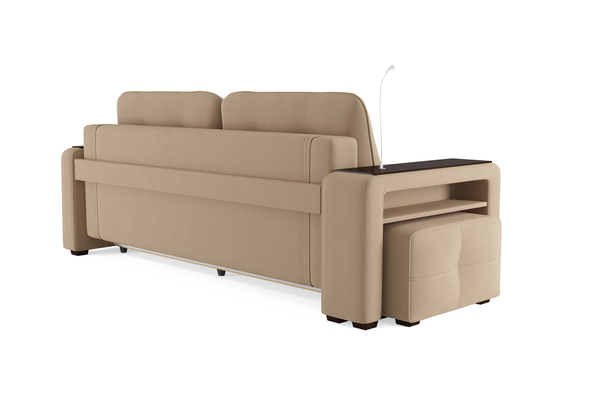 Диван «SMART 4» — это не просто мягкая мебель, а один из ключевых элементов интерьера с обширным функционалом, где эстетика тесно соседствует с комфортом и эргономичностью.  Одна боковина оснащена карманом для хранения мелочей и гаджетов, другая боковина совмещает одновременно: рабочую поверхность, за счет широкой накладки, двойной  usb - порт  и портативную лампу точечного света, которая входит в комплект. Добавить контрастных деталей в интерьер поможет пуф, интегрированный в подлокотник. Этот вариант для современных людей, которые ценят комфорт и удобство отдыха. Мягкое сиденье с легкостью трансформируется в просторное спальное место, на котором смогут утроиться ваши гости. Стильный и уютный, он станет отличным решением, если вы ищите не только красоту, но и комфорт.