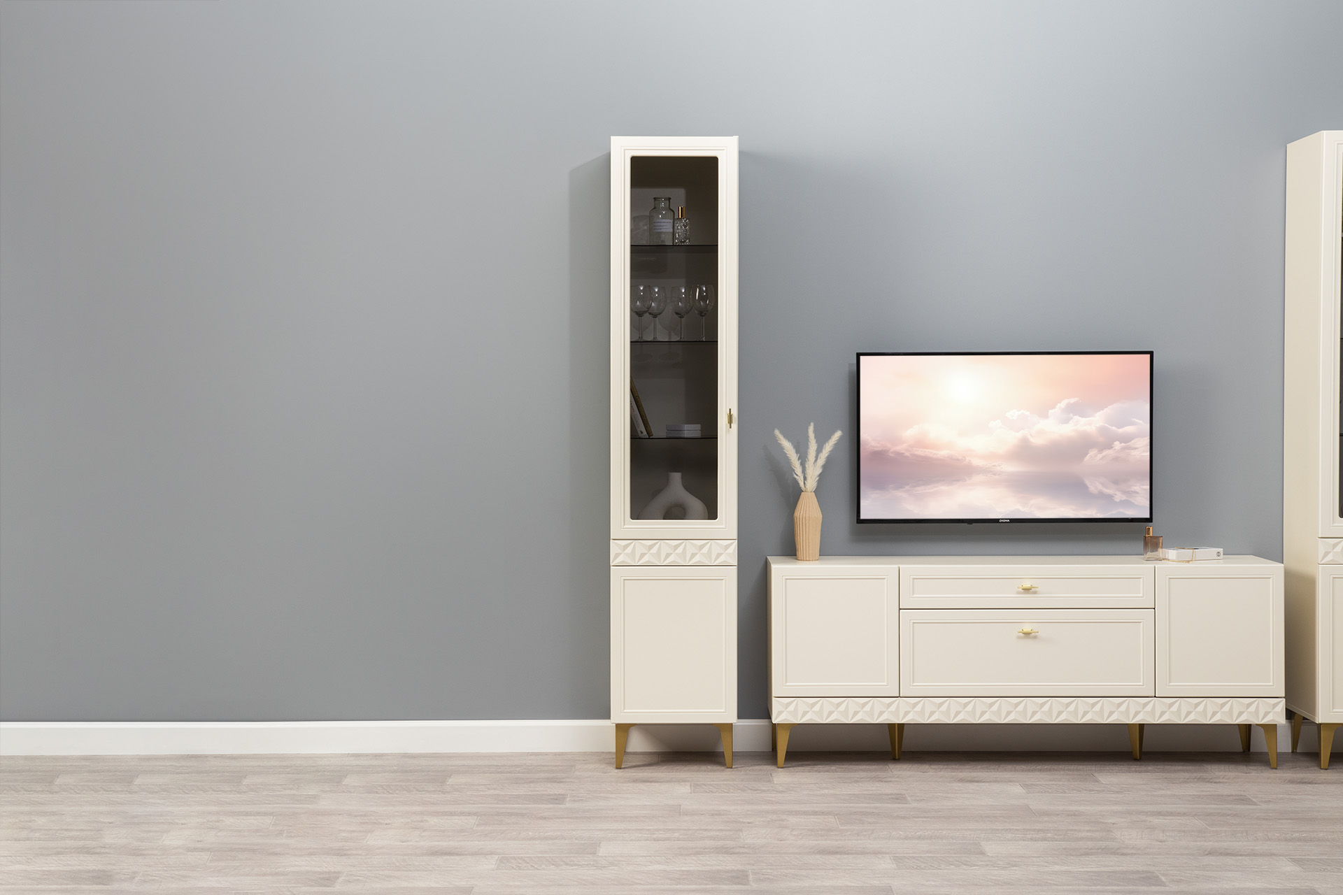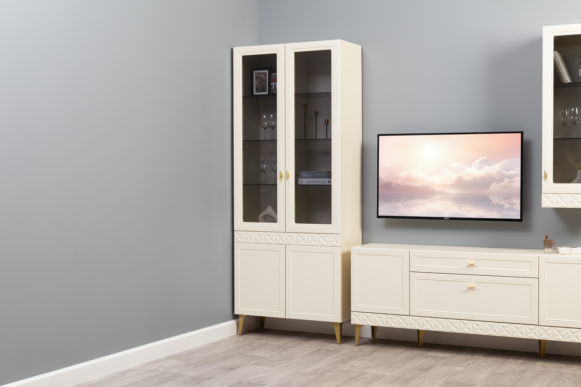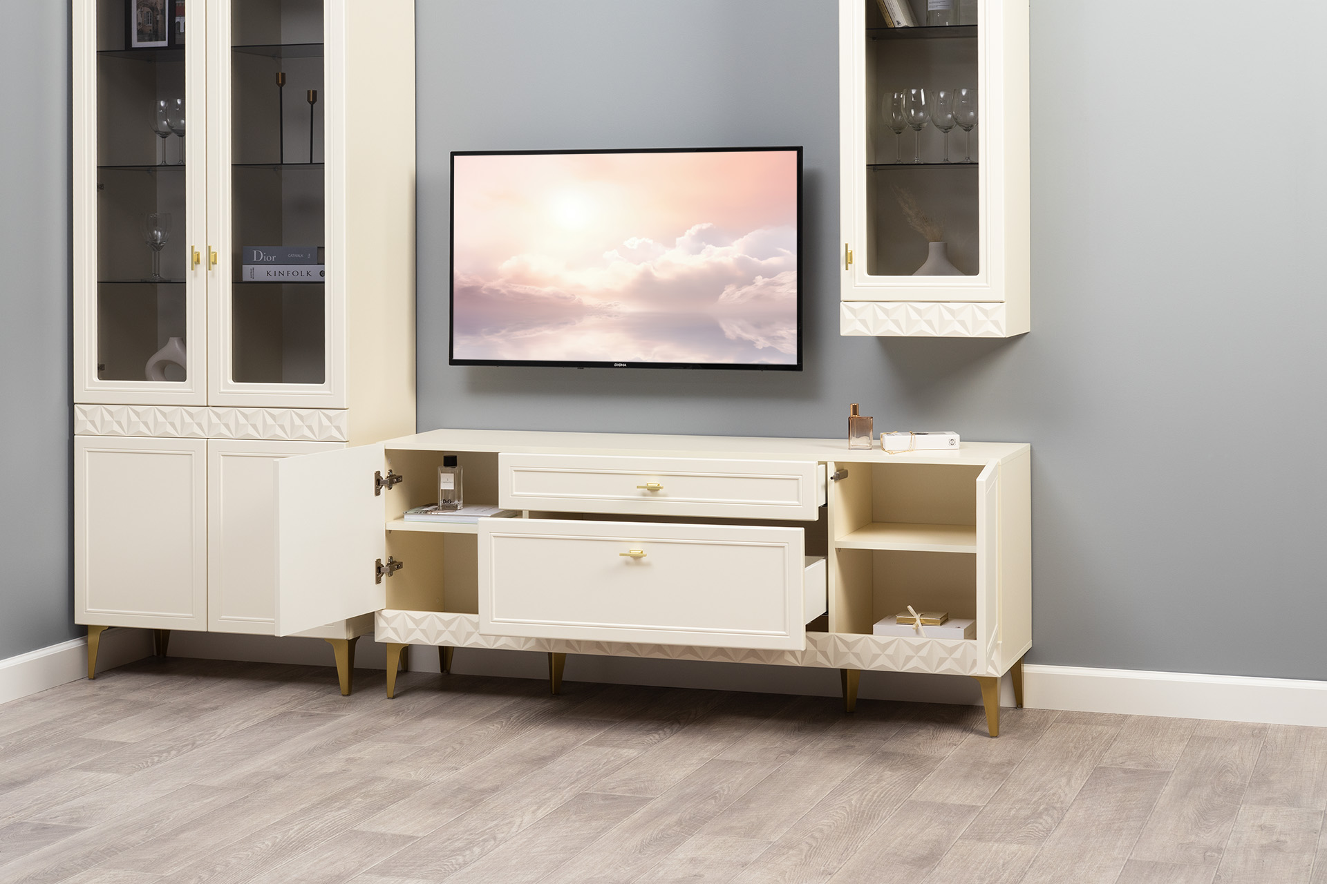 Гостиная Марион композиция 1 слоновая кость С341 PE, слоновая кость 6898 ПВХ, белый PE шагрень (собирается на любую сторону)