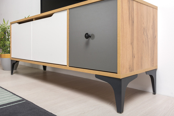 Три распашных фасада. Распашные двери на четырехшарнирных петлях. Ручка и опоры металл черный матовый. Корпус: ЛДСП 16 мм. Фасады: ЛДСП 16 мм и МДФ 16 мм.
