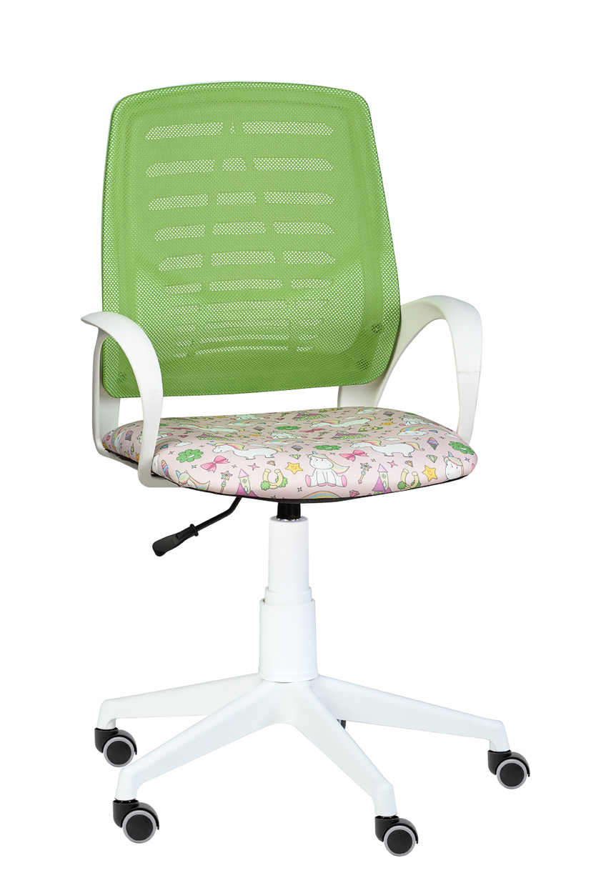 Кресло на колесах Ирис белый каркас, обивка сидушка - ткань саржа единороги, спинка салат,  подлокотники пластик, крестовина пластик, без качания