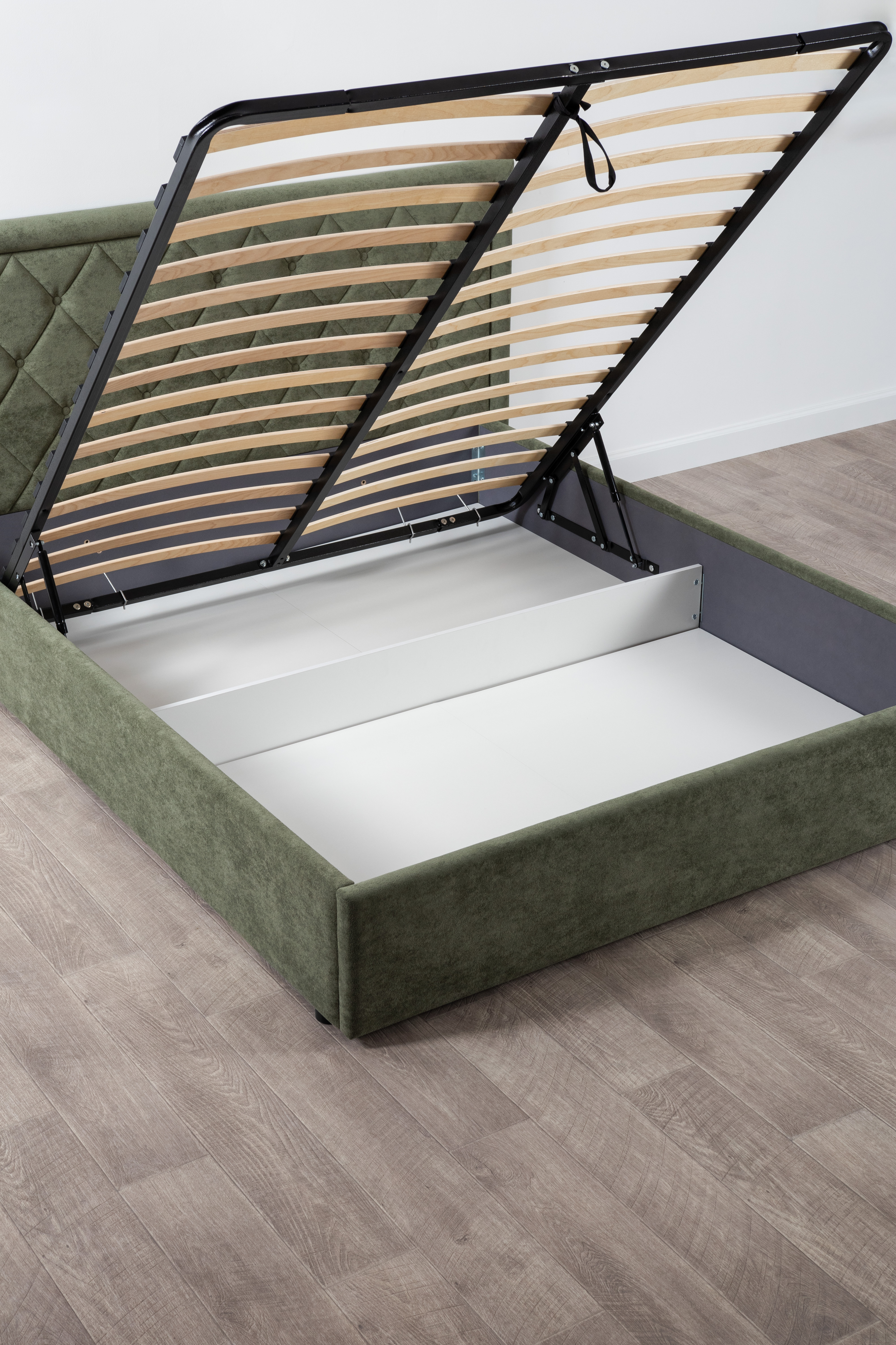 Основание кровати укомплектовано матрасодержателями. Жесткое кроватное дно из ЛДСП 16 мм на опорах 25 мм.