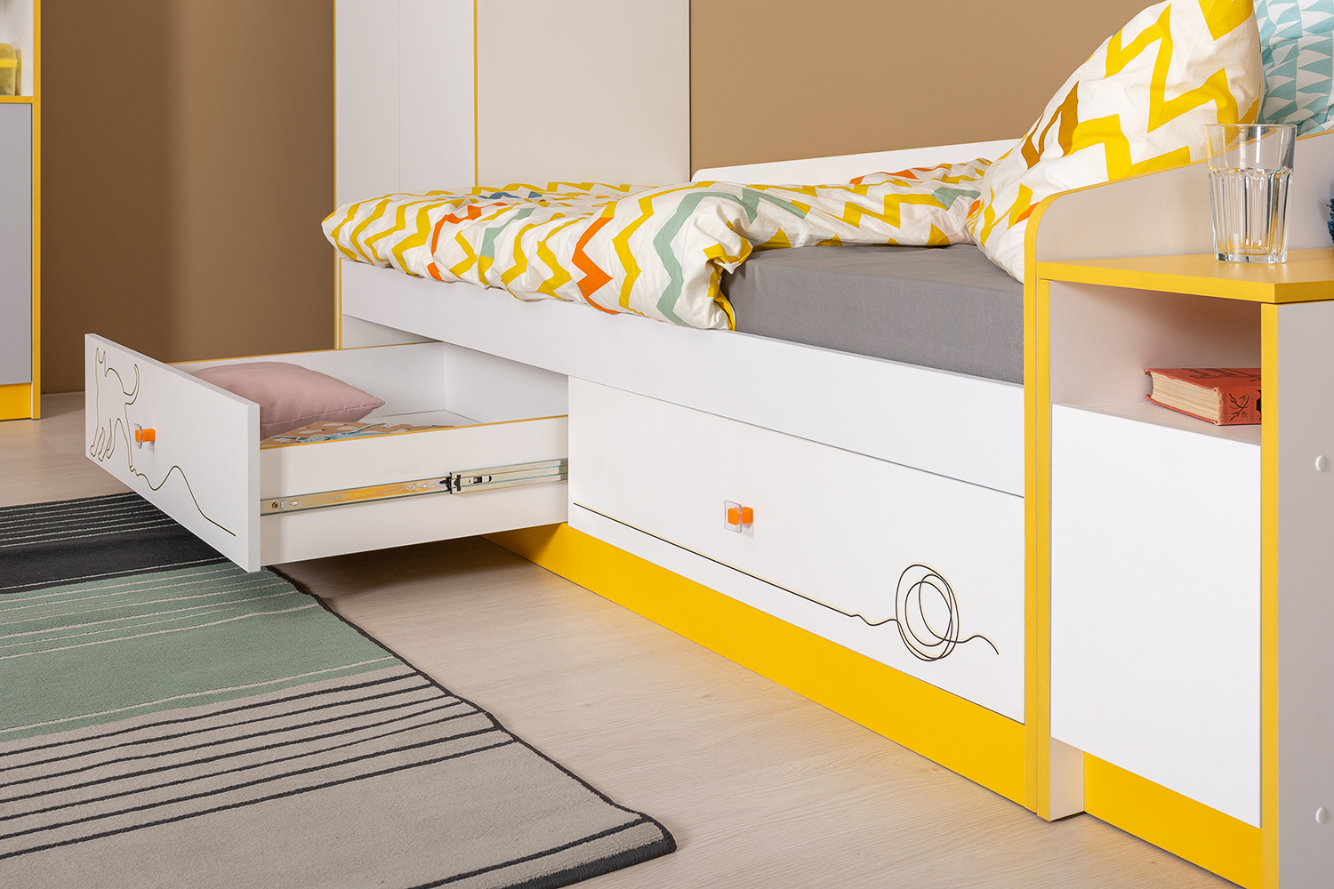 Многофункциональная модульная система Альфа для детской комнаты выполнена в модном сочетании монохрома и ярких, цветных, графичных линий. Особый акцент ставят прозрачные ручки с цветным основанием софт-тач. Коллекция изготавливается в двух цветовых решениях: жизнерадостный «солнечный свет» или свежий «зеленый лайм», можно создавать комбинации в одном цветовом решении или сочетать модули разных цветов между собой.