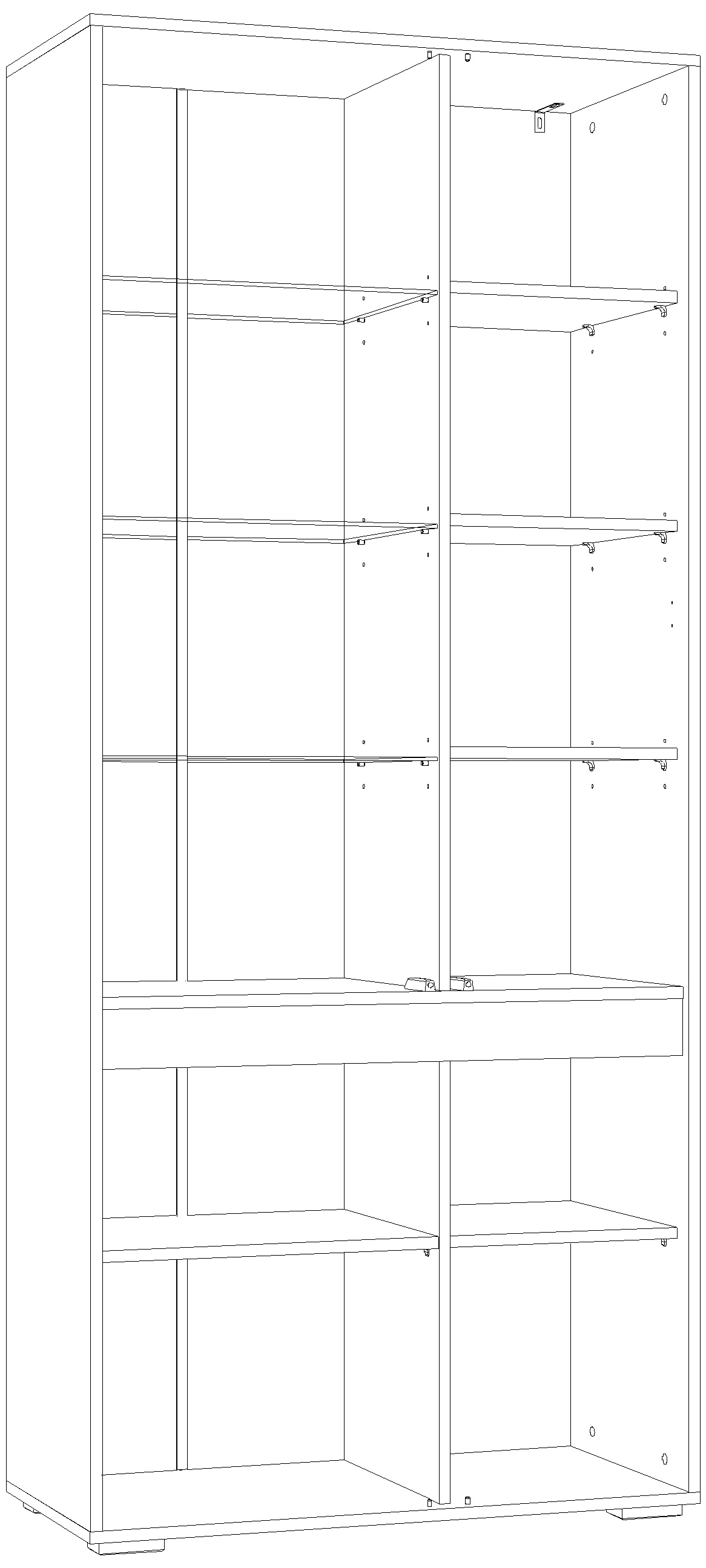 Фурнитура: Шкаф собирается с помощью шкантов, евровинтов, эксцетриковых стяжек и дюбелей быстрого монтажа. Полки из ЛДСП 16 мм на фиксирующих полкодержателях. Полки из стекла 5 мм на полкодержателях с кембриком. Опоры регулируемые №01 "Риальто". Петли вкладные Gelony. Ручки нижних фасадов интегрированные. Механизм открывания Hettich Push to open. Все видимые отверстия закрываются заглушками в цвет корпуса.