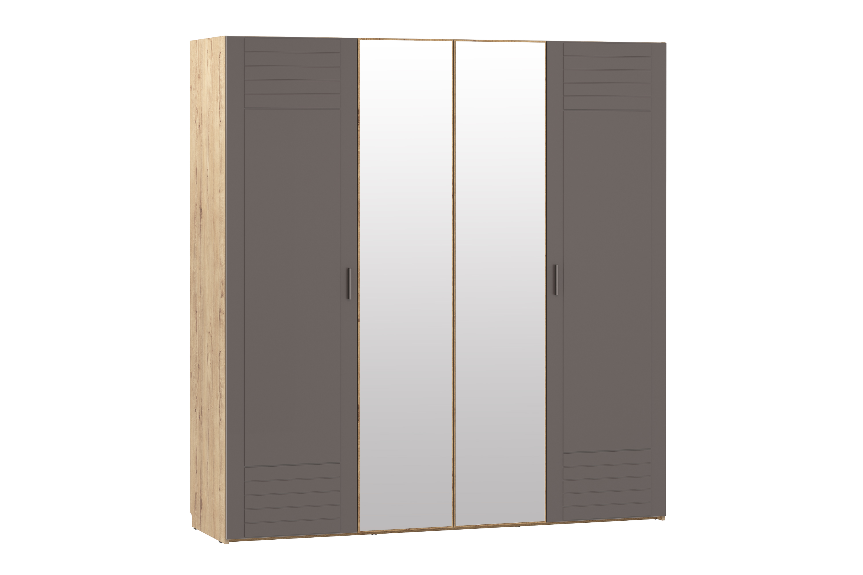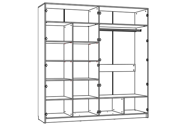 Четырехстворчатый шкаф LIVORNO НМ 013.58 станет достойной альтернативой гардеробной комнате, сэкономит пространство и задаст стиль интерьеру спальни. Внутри модуль разделен на две равные секции. В левой части шкафа находится секция из восьми полок для хранения одежды в сложенном виде. В правой половине модуля установлена штанга для одежды на вешалках плечиках. Зеркальные фасады добавят свет и визуально расширят комнату.