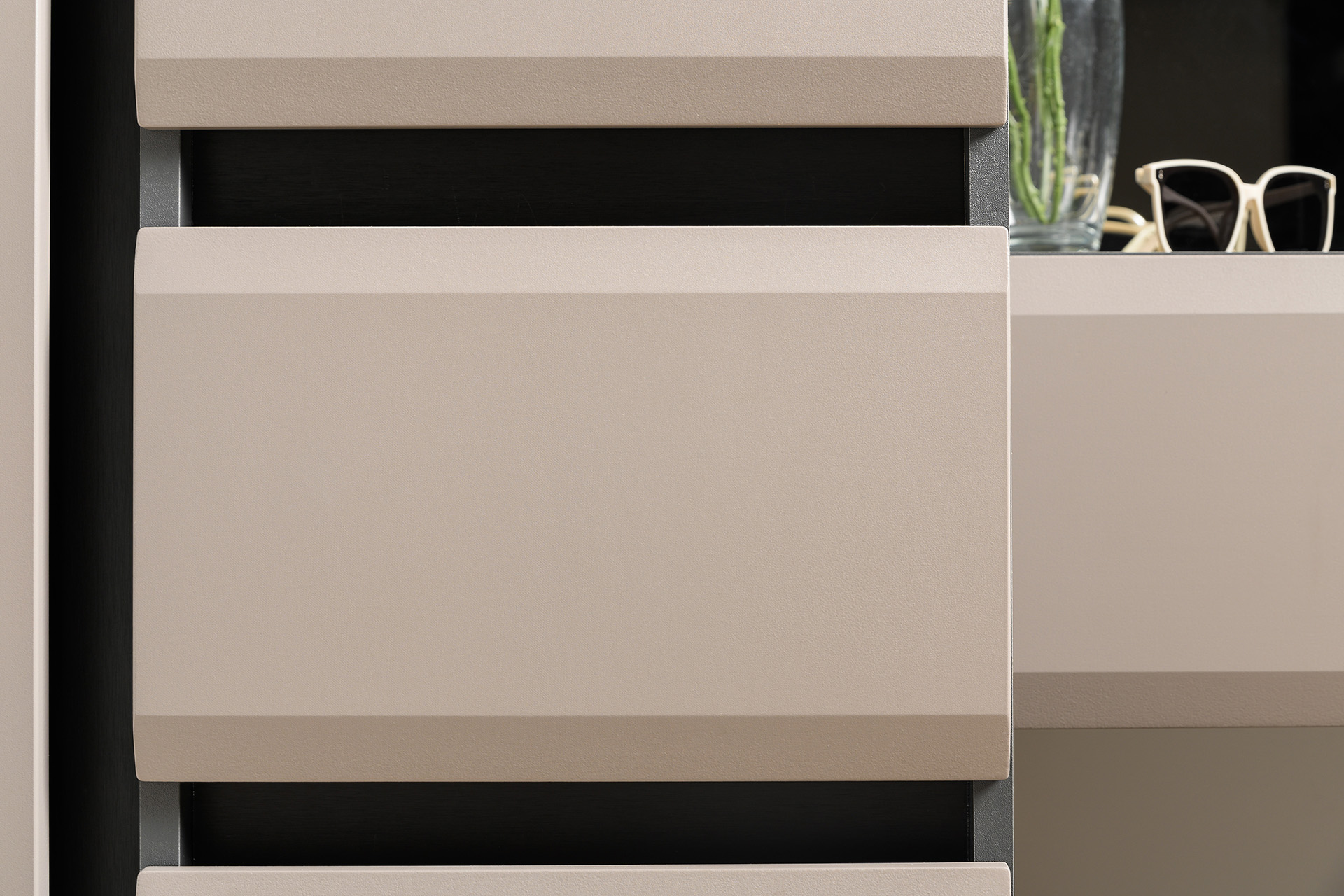 Минималистичные фасады в трендовом цвете без лицевой фурнитуры открываются за край либо нажатием (push-to-open).