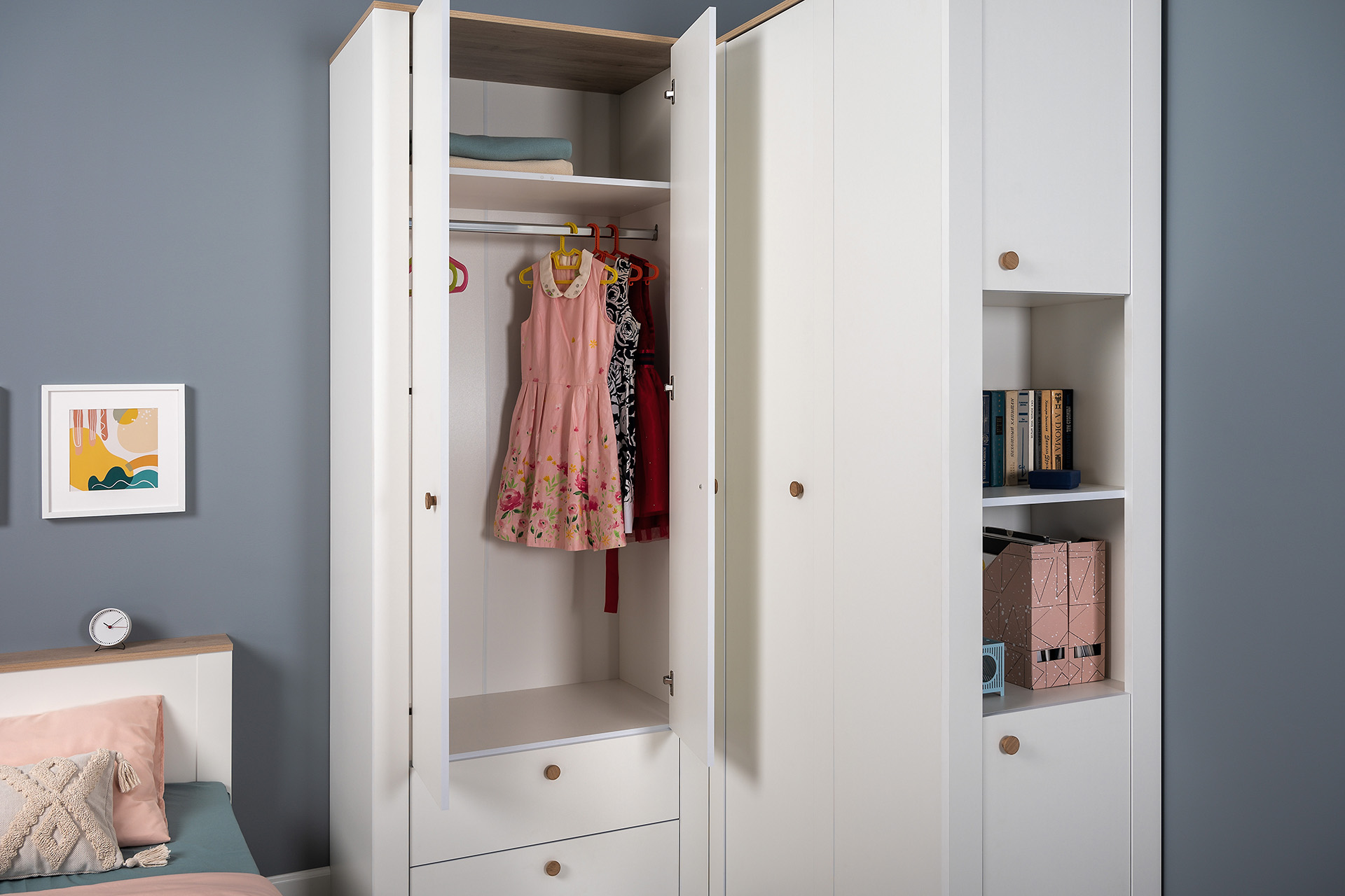 Джастин уникален тем, что подходит для разных возрастных категорий: для малышей – кроватка с защитным бортиком, съемными тканевыми кармашками и выкатными ящиками; для подростков – кровать с полноценным спальным местом и нишей для книг в изголовье; всевозможные модули для хранения. А в ящик письменного стола можно спрятать под замочек свои сокровища и секреты.
