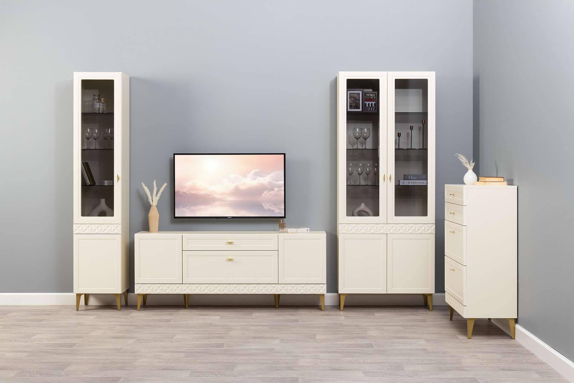 Изящные линии, глубокая фрезеровка фасадов из МДФ и благородные оттенки. Утончённая «Слоновая кость» и изысканная «Олива Шагрень» с глубоким зелёным тоном — создают атмосферу уюта, тепла и благородства. Металлические ручки и опоры золотого цвета придают мебели утончённый блеск, а петли и направляющие с доводчиками обеспечивают плавное и бесшумное закрытие фасадов.