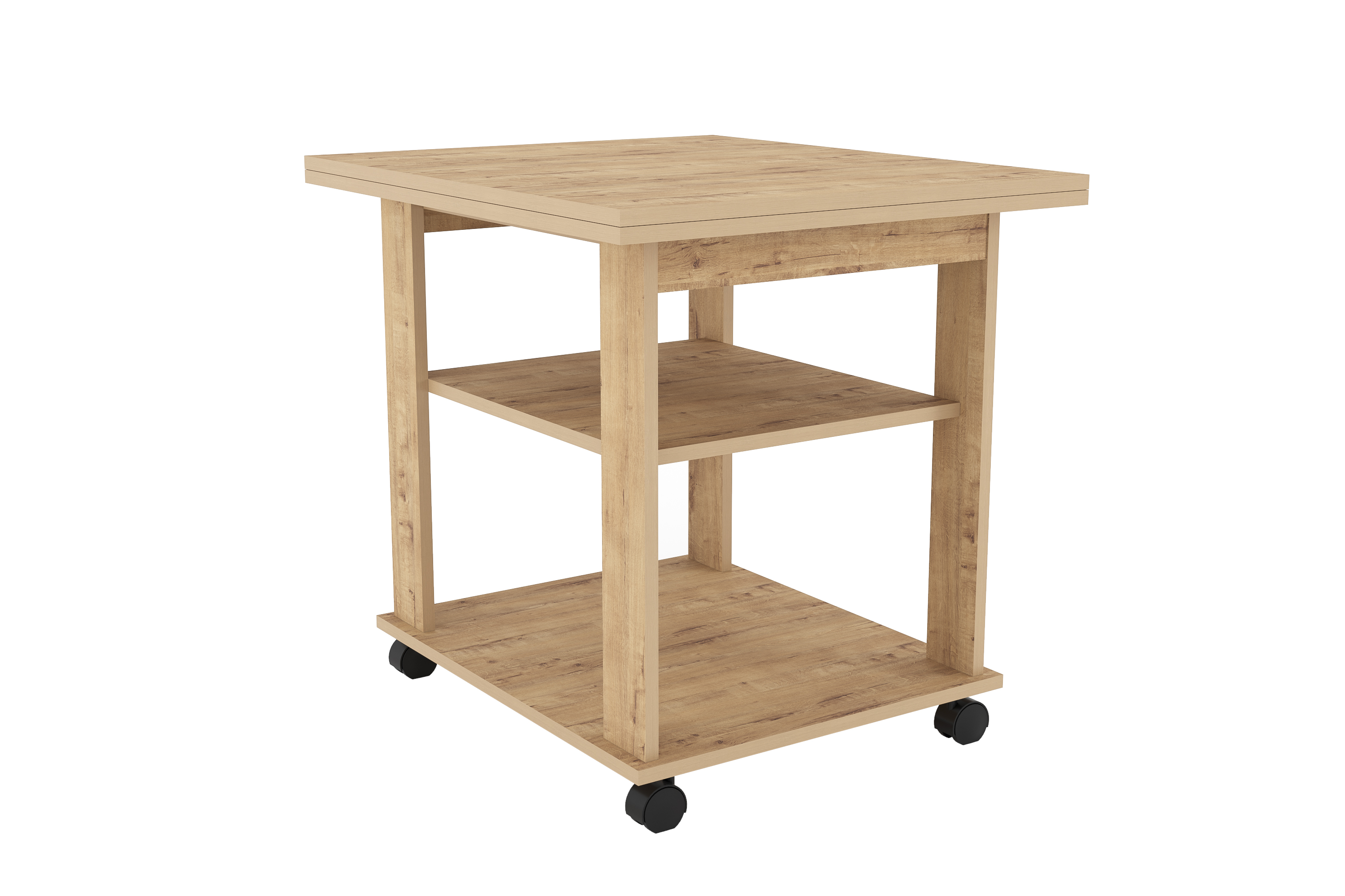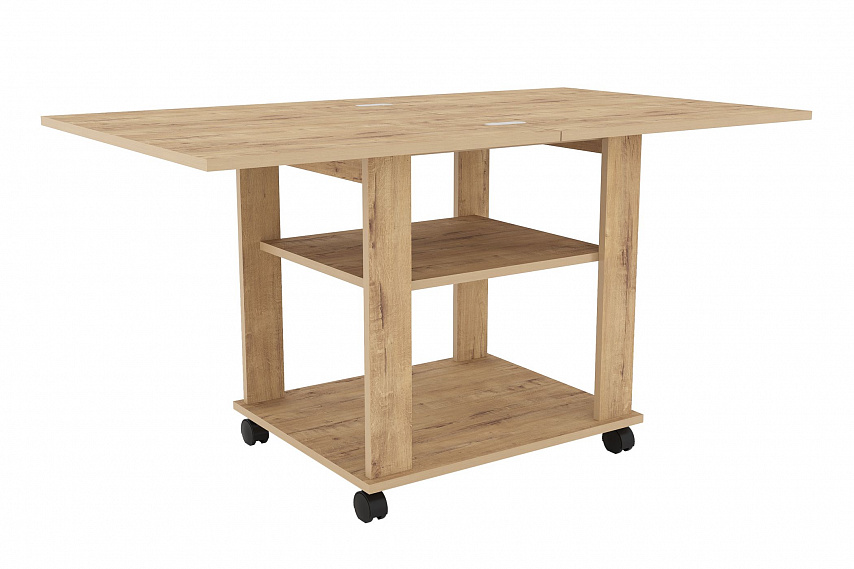 Благодаря поворотному механизму и подвижному соединению столешниц его можно раскладывать для увеличения площади. Если планируется частое использование мебели в различных комнатах, то колеса облегчат перемещение. Все механизмы конструкции обладают простым использованием.