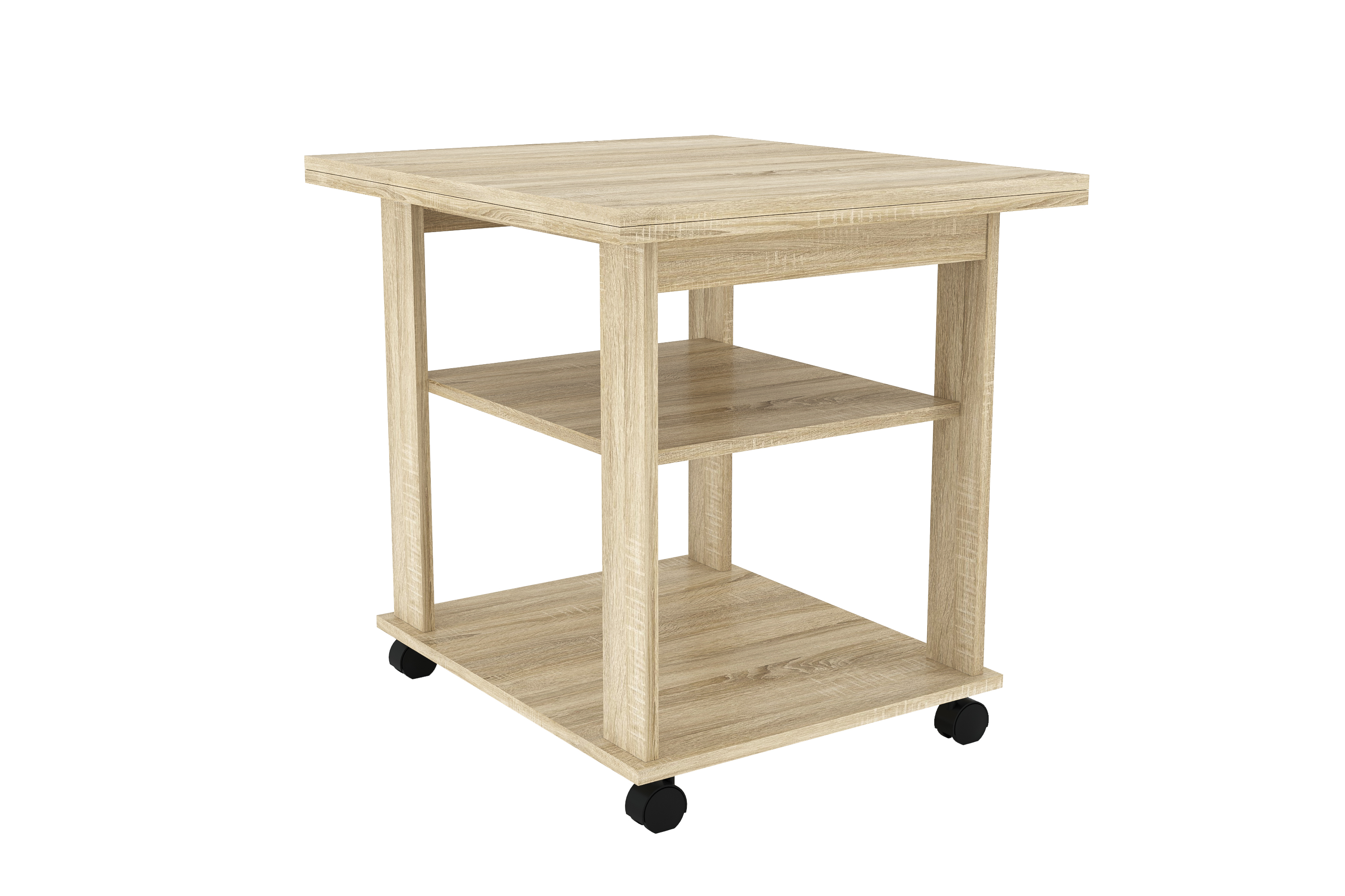Благодаря поворотному механизму и подвижному соединению столешниц его можно раскладывать для увеличения площади. Если планируется частое использование мебели в различных комнатах, то колеса облегчат перемещение. Все механизмы конструкции обладают простым использованием.