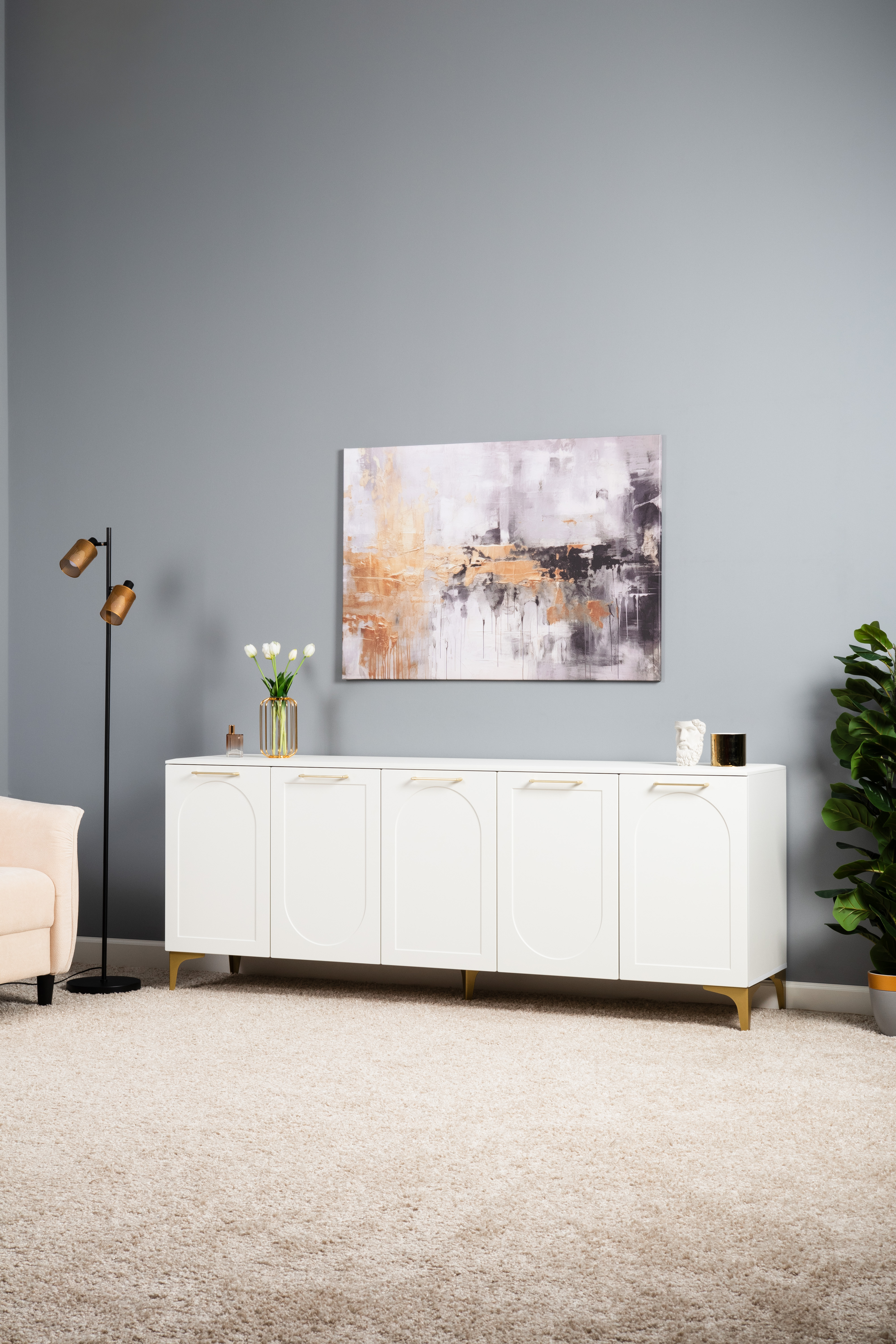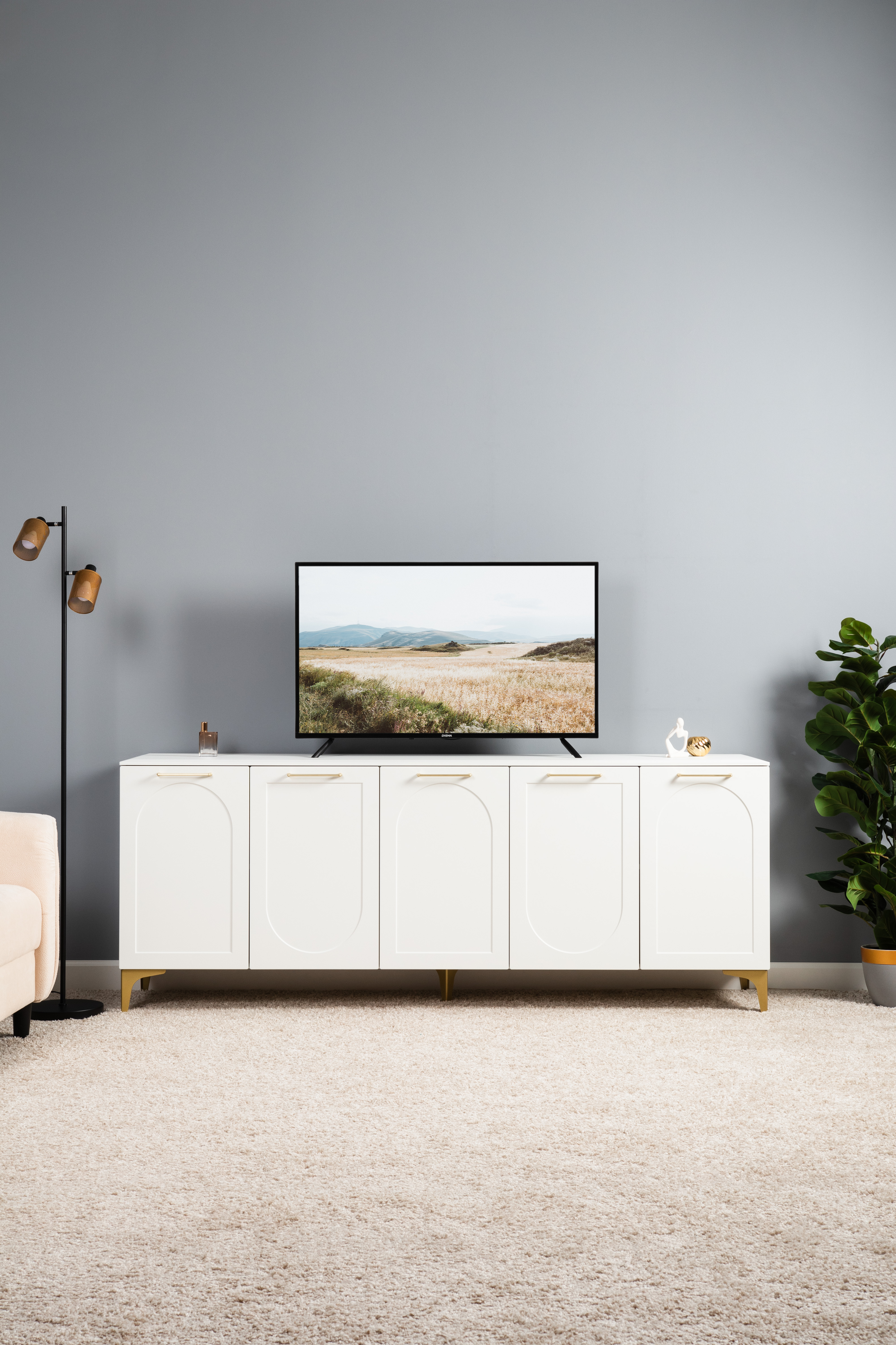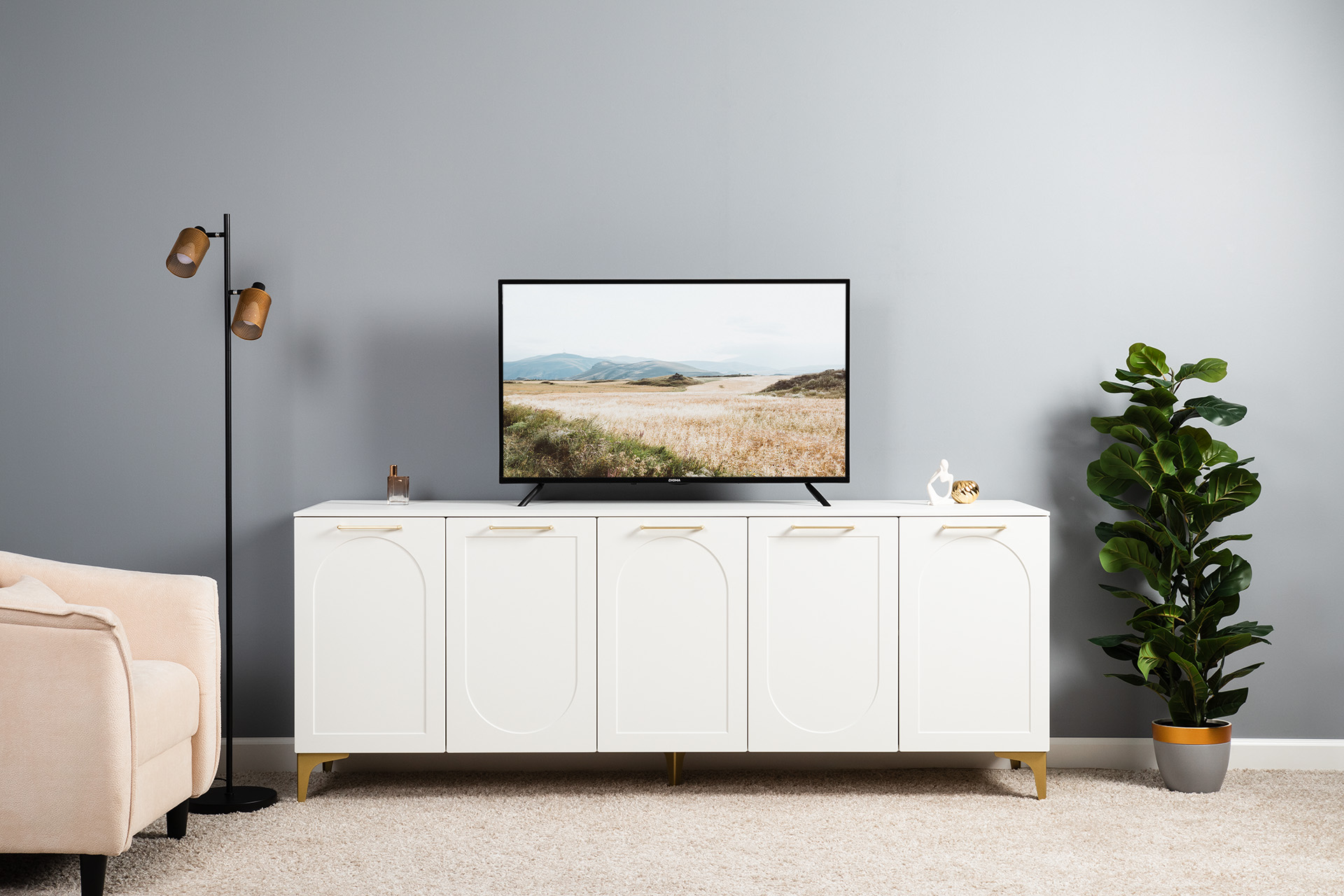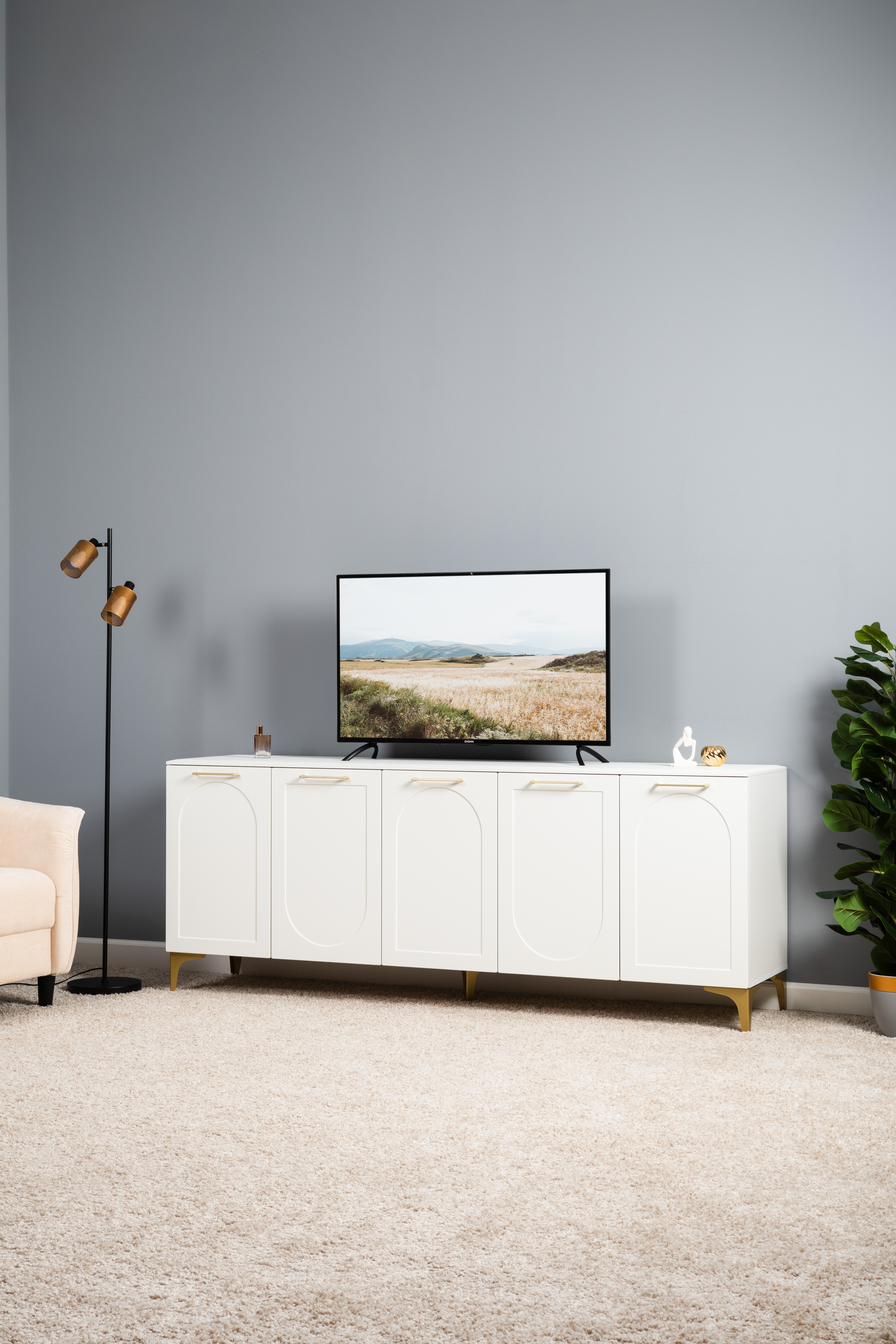 Тумба под ТВ в гостиную Петра 13.281 белый PE шагрень, милк софт ПВХ, бетон чикаго беж ПВХ