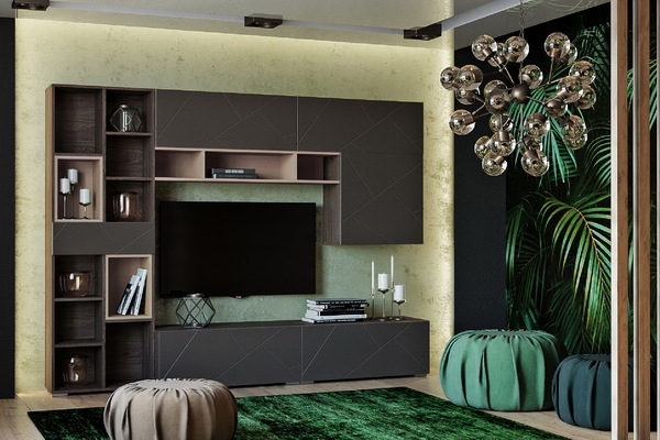 Тумба под ТВ в гостиную Муар 13.262 орех селект каминный, черный глянец ПВХ