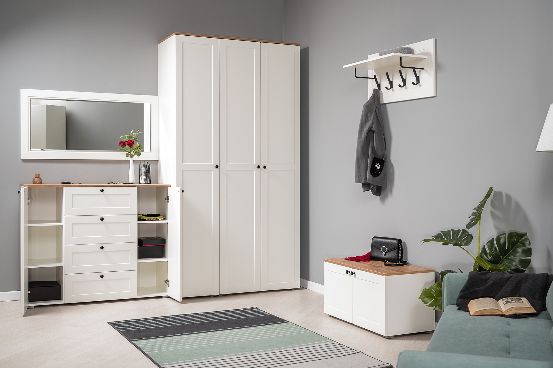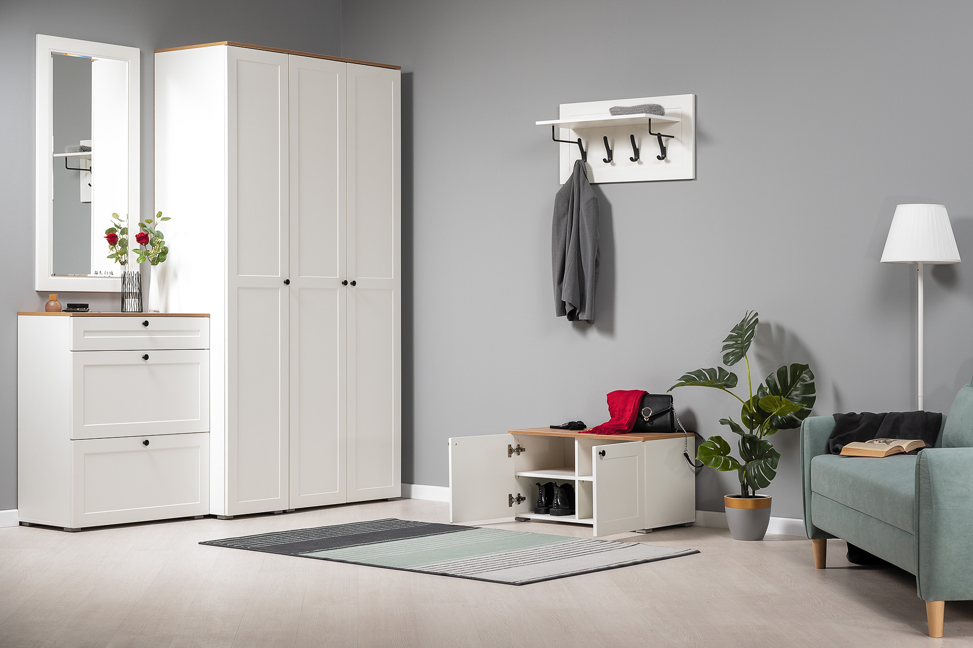 Прихожая доступна в двух цветовых решениях – белый/графит в сочетании с теплым древесным декором.