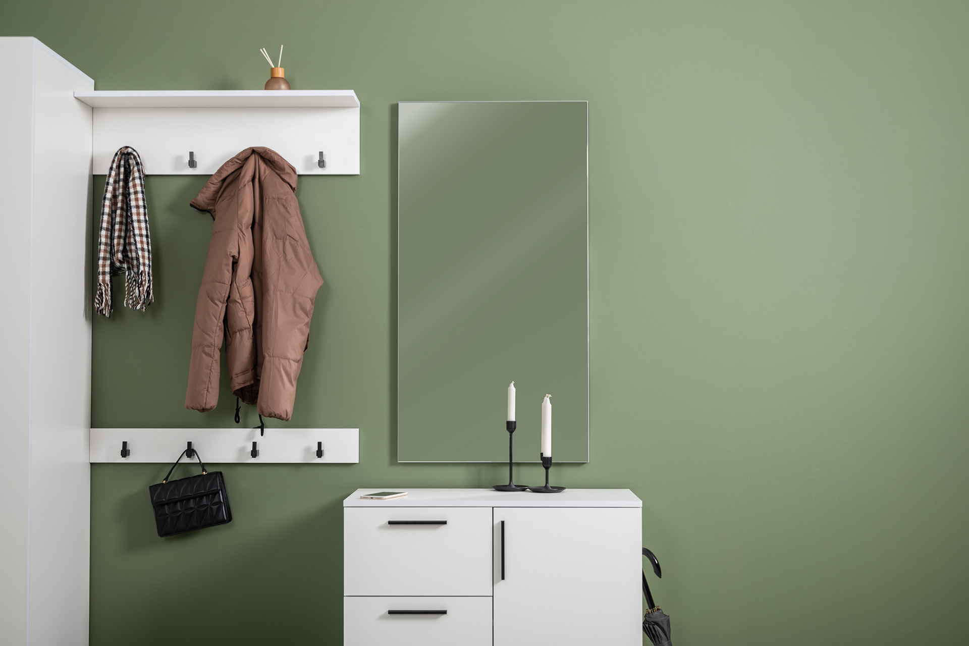 Нейтральный белый цвет визуально расширит ограниченное пространство прихожей.